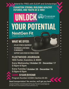 Share this workshop Next Gen Fit (Wed) City of Evanston Next Gen Fit is a safe, age-appropriate weight training program for middle school students. It focuses on building strength, confidence, and healthy habits through proper technique, functional exercises, and a supportive environment. Perfect for all fitness levels!Webtrac ID: 412300 Section B5General Cost: $150eLEAP Scholarship User Cost: $75 Age: 10—15 Cost: $75.00 + Type: In Person eLEAP