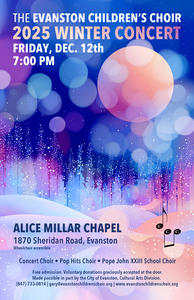 Application details Program details Date + Time Date(s): 12/12/2025 - 12/12/2025 Time: 7:00 PM - 8:30 PM Registration deadline: n/a Contact Gary Geiger gary@evanstonchildrenschoir.org 847-733-0814 Location 1870 Sheridan RoadEvanston,IL 60208