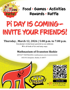 Share this workshop Pi Day Party Mathnasium of Evanston Skokie Celebrate Pi Day with food, games, activities and rewards that all have to do with Pi! Visit website Register Now Age: 2—65 Cost: FREE Type: In Person
